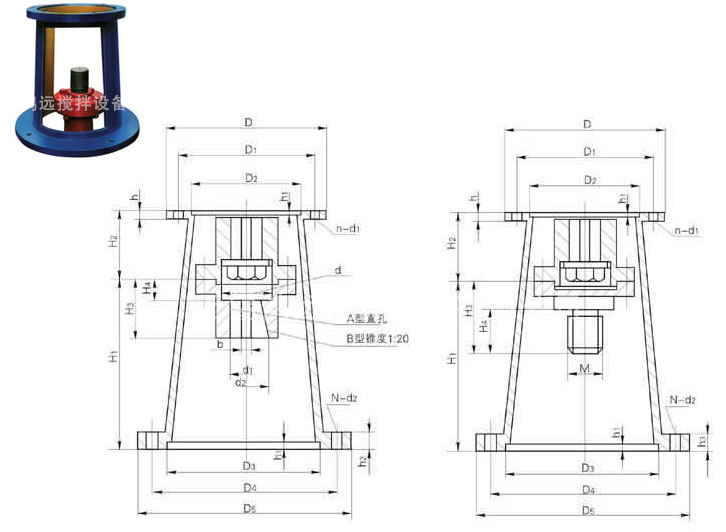 本機(jī)架適用于擺線針輪減速機(jī)的聯(lián)接,配剛性聯(lián)軸器,上聯(lián)軸器裝JA型直孔,下聯(lián)軸器裝A型直孔或B型錐孔,錐度為1:20的聯(lián)軸器。該機(jī)架無支承適用于反應(yīng)器傳來的軸向力不大時使用。
