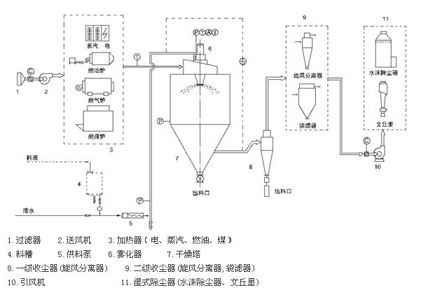 空氣通過過濾器和加熱器,進入干燥器頂部的空氣分配器,熱空氣呈螺旋狀均勻進入干燥器。料液由料液槽經(jīng)過濾器由泵送至干燥器的離心霧化器,使料液噴成績效的霧狀液滴,料液和熱空氣并流接觸水分迅速蒸發(fā),在極短時間內(nèi)干燥為粉末狀成品。成品由于干燥塔底部和旋風(fēng)分離器排除,廢棄由風(fēng)機排出。